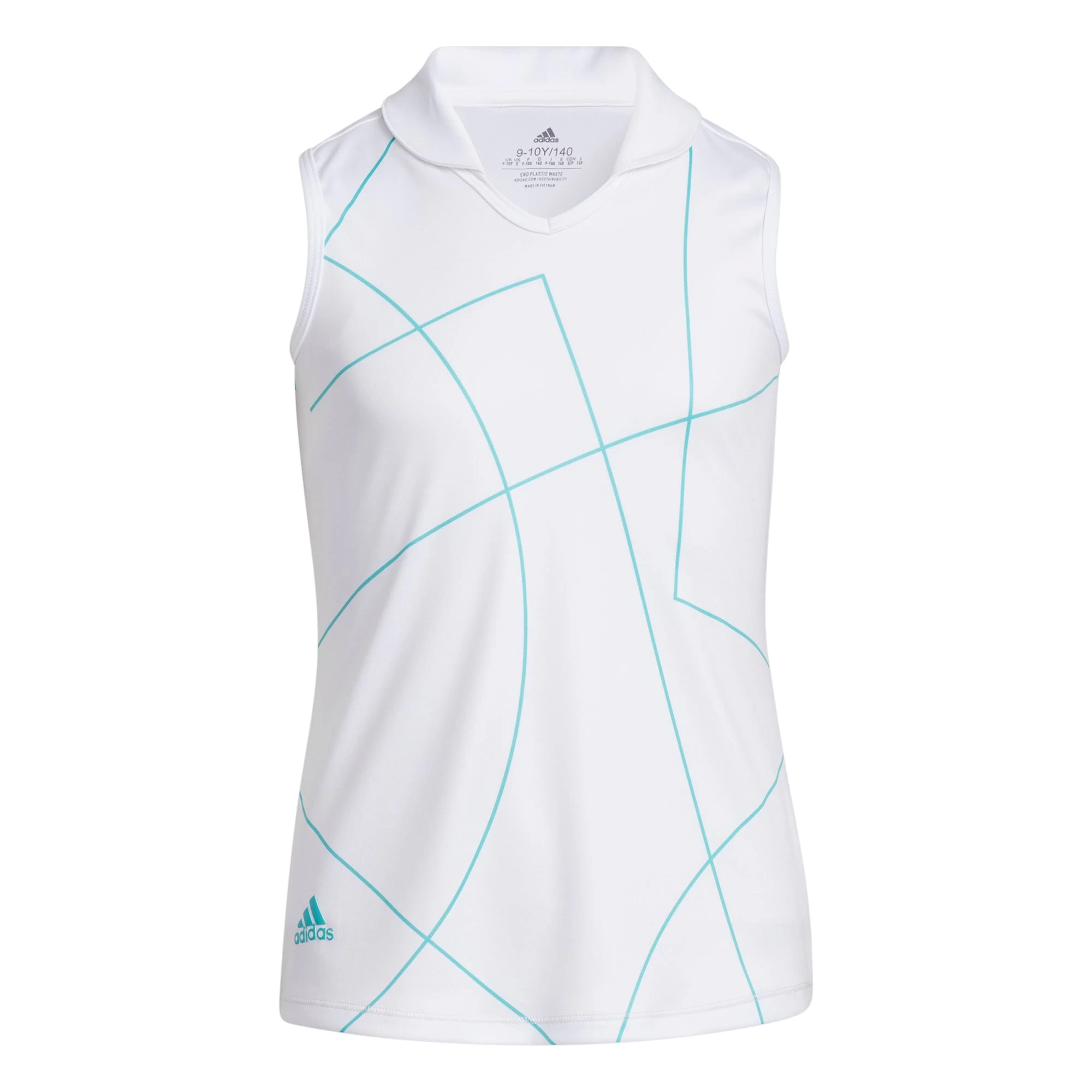 Keep your girl cool during warm rounds with the Adidas Girls Sleeveless Golf Polo. This polo features a sleeveless design, v-neck, and polo collar. A shaped hem and subtle graphics give this polo some added style.