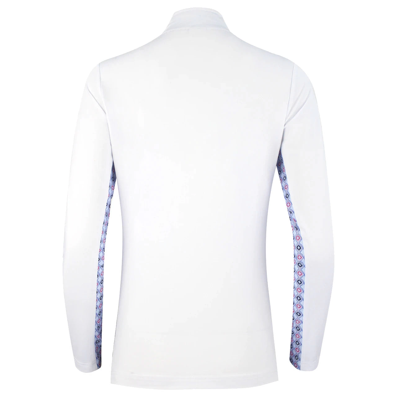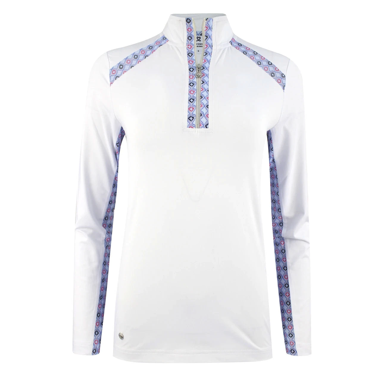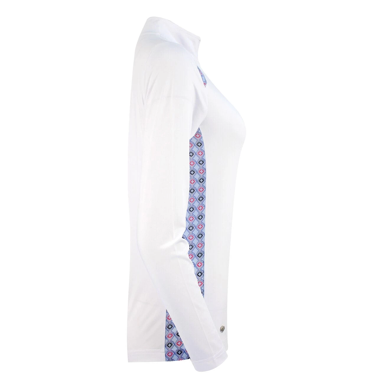 The Daily Sports Sue Long Sleeve Golf Polo will have you looking and feeling your best out on the course. Perfect to wear with shorts, skorts, or pants! It features a regular fit, straight hem, mock collar, zip placket, technical stretch, and argyle mesh print trim on the shoulders, placket and sleeves. This polo will feel dry, cool, and comfortable while wearing.