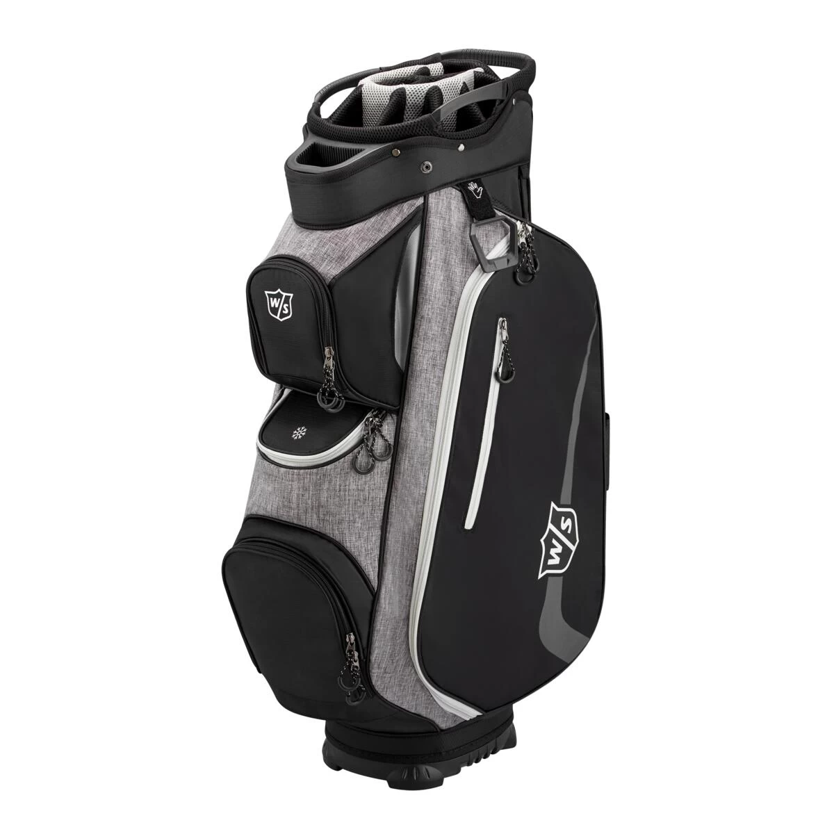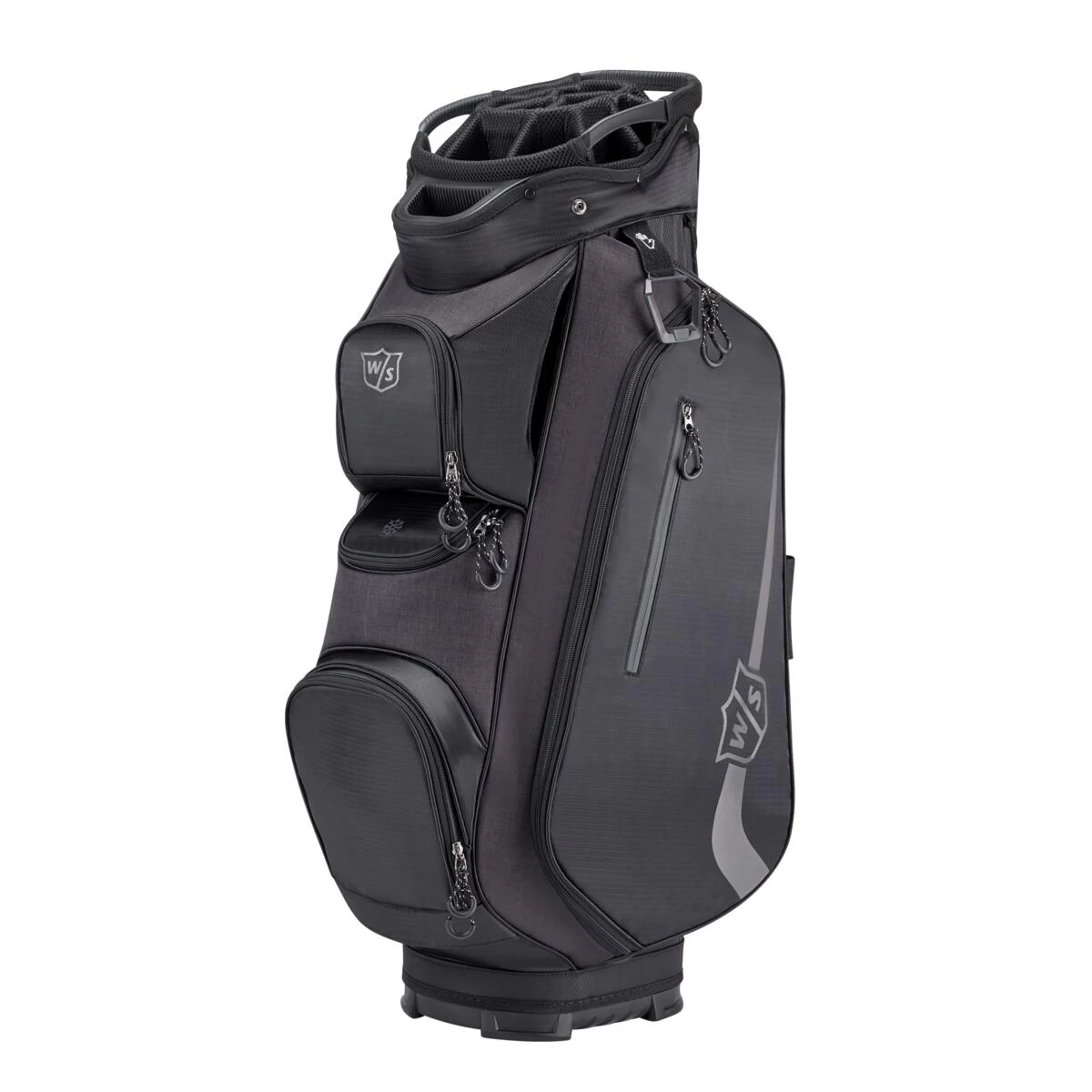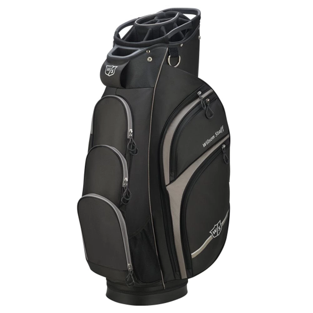- STAY ORGANIZED WITH THE WILSON STAFF XTRA CART BAG:  10″× 8.5″ 14-way top with 3 side lift handles – 4 full-length dividers – External putter well fits oversized grip – 2 Full-length large garment side pockets – 1 Front rangefinder pocket – 1 Cooler pocket – 1 Large base accessory pocket – 2 Large external valuables pockets